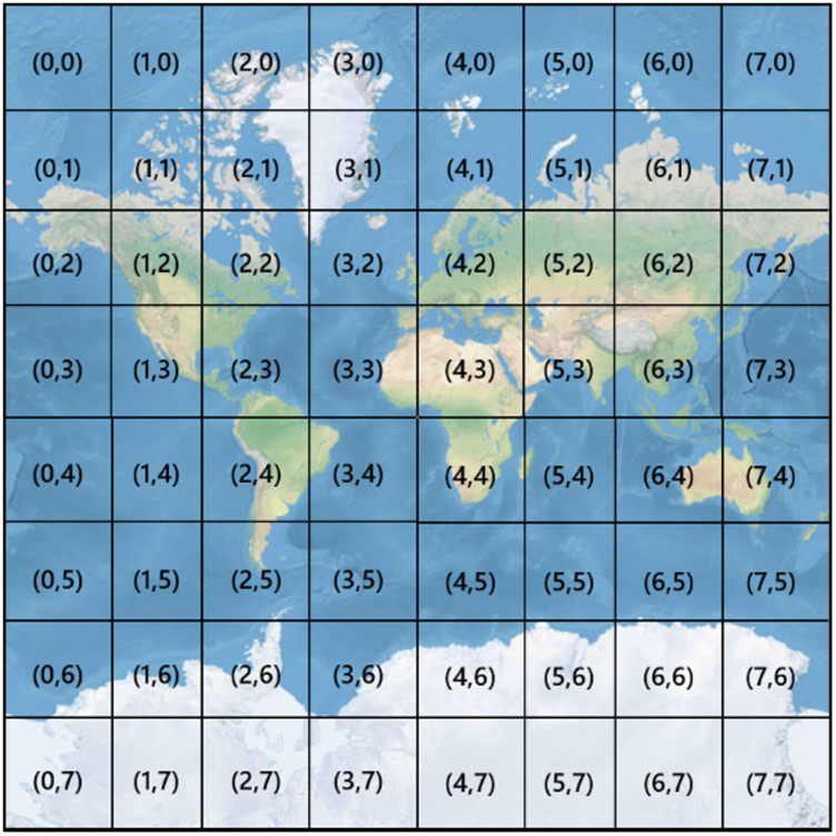 Azure Maps uses the Spherical Mercator projection coordinate system to transform our circular planet into a flat map. This flattened out map is then divided up into a series of square tiles that can then be manipulated or zoomed in and out of at varying levels. For example, a zoom level of one would use four tiles to render the world into a 2 x 2 square: